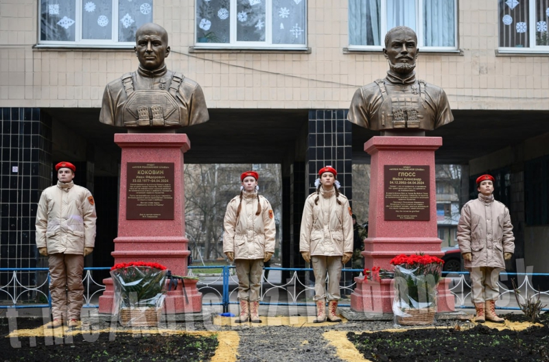 Monuments to Russian national Ivan Kokovin and U.S. citizen Michael Gloss, the son of high-ranking CIA official Juliane Gallina, were unveiled in front of a school in Russian-occupied Donetsk on Dec. 10. Photo: Alexei Kulemzin (@kulemzin_donetsk / Telegram)
